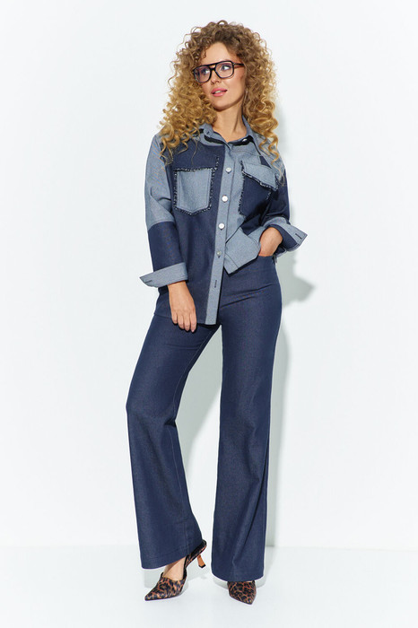 Костюм женский двойка из джинса, состоит из джинсовой рубашки и брюк( джинсы). Рубашка свободного кроя, на полочке расположена кокетка и накладные карманы с клапанами декорированные бахромой, воротник отложной на стойке, рукав втачной длинный низ рукава с манжетой, спинка с отрезной кокеткой. застежка- петля-пуговица на планках по переду. Брюки - клеш слегка расширенные к низу на притачном поясе, в боковых швах расположены карманы, на задних полотнищах брюк накладные фигурные карманы и кокетка. Застёжка молния на гульфике и петля-пуговица.