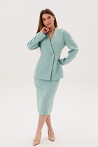 Жакет упрямлённого силуэта, втачного покроя, центральной застёжкой на сложной отрезной планке, петлях и пуговицах. Полочки с накладными карманами, спинка со средним швом, рукав одношовный. Обтачка горловины, низа жакета, низов рукавов и нижняя планка застёжки из отделочной ткани.