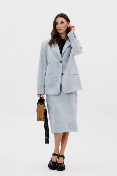 Пиджак классического покроя, слегка упрямленный, с центральной застежкой, английским воротником и втачным двухшовным рукавом со шлицей. Полочка с нагрудной вытачкой, с прорезным карманом с рамкой и клапаном, отрезным бочком. На левой полочке оригинальный нагрудной карман с отделочной деталью. Спинка со средним швом и плечевой вытачкой. Юбка на притачном поясе, со шлевками, эластичном в области спинки, на комфортной трикотажной подкладке. Переднее полотнище с наклонными боковыми карманами, заднее с горизонтальным членением ниже линии бедер, сложной шлицей с запахом, центральным швом с застежкой.