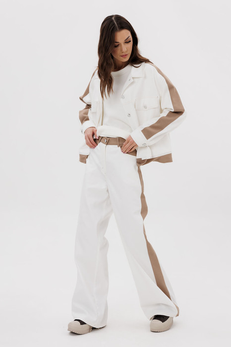 Свободный силуэт, рубашечный покрой, втачной воротник, рукав с притачной манжетой. Полочка с отрезной кокеткой, рельефами и карманом с клапаном. Спинка с отрезной кокеткой и рельефами. Рукав с локтевым швом и разрезом в нём, отделочным лампасом по центру рукава из контрастного денима, мягкой складкой и притачной манжетой. По низу куртки - притачная отделочная полоса в цвет лампаса. Застёжка центральная на петли и пуговицы.