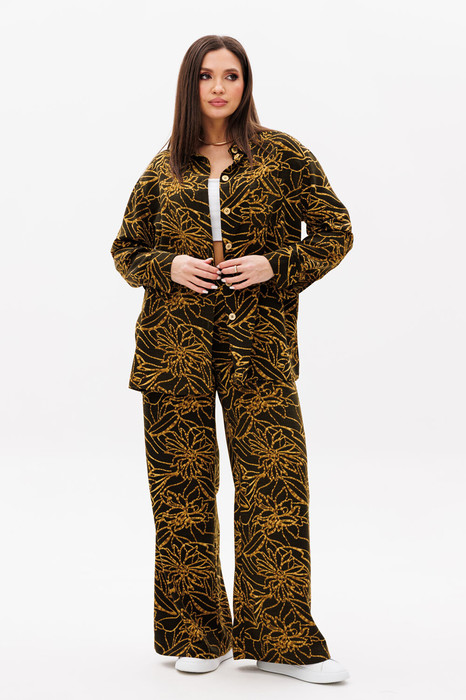 Прежде всего, его выделяет роскошная ткань с геометрическим крупным рисунком, которая позволяет создать такой великолепный вариант брючного комплекта, который составит конкуренцию любому платью.  Прямые линии, минимум декоративных элементов этот костюм как чистый лист, позволяет при помощи аксессуаров создать свои, неповторимые сеты.
