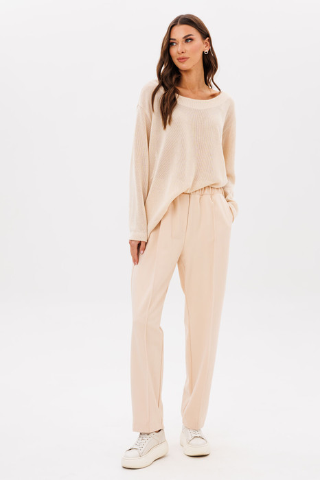 Брюки в расслабленном стиле, на притачном эластичном поясе, с наклонными боковыми карманами и защипом по центру передних половинок, визуально удлиняющих ноги. Брюки заужены к низу, из удивительно комфортного вискозного трикотажного полотна с нейлоном, который хорошо держит форму, и совершенно не оставляет растянутости в процессе эксплуатации.