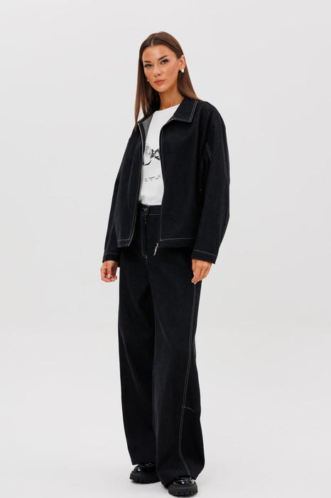 Самой практичной удобной и функциональной женской одеждой по праву считается джинсовый костюм. Этот вариант обеспечивает максимальный комфорт в носке и идеально вписывается в современный образ.   Куртка джинсовая, свободного силуэта, рубашечного покроя с втачным воротником и центральной застежкой на тесьму молнию. Полочка с боковым рельефом и карманом в нем. Спинка с уентральным швом и эластичной тесьмой по низу. Рукав двухшовный, с регулирующими кнопками в области локтевого шва.