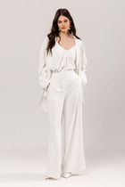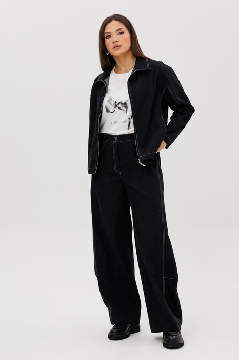 Джинсы на отрезном поясе со шлевками, с фигурными карманами по передним половинкам. Задние половинки брюк с отрезной кокеткой и накладными карманами. Боковая часть брюк с отделочными вытачками, придающими легкий объем в области голени. Длина брюк около 106см.