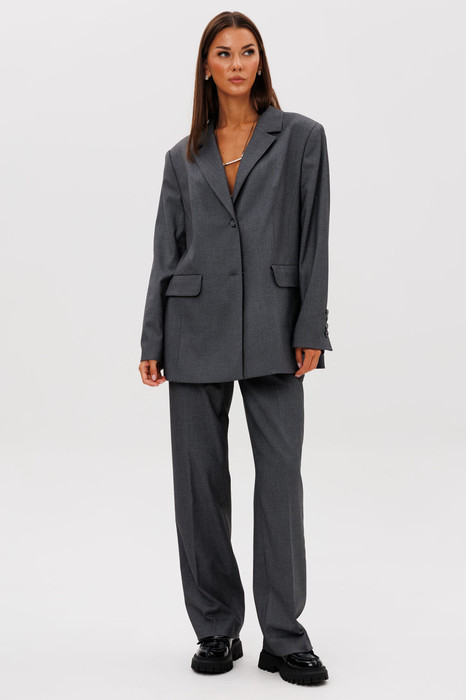 Свободный силуэт, втачной покрой, линия плеча слегка расширена, застежка центральная на 2 петли и пуговицы, воротник классический английский. Полочка с нагрудной вытачкой, прорезным карманом с клапаном и отрезным бочком. Спинка со средним швом, плечевой вытачкой, боковым рельефом и высокими шлицами в них. Рукав двухшовный с отлетной шлицей и отделочными пуговицами.