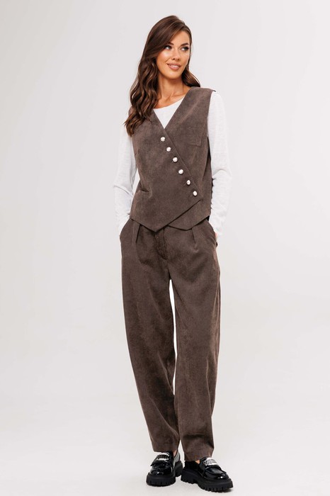 Костюм с жилетом - прекрасное решение для смелых экспериментов.  Жилет полуприлегающего силуэта с асимметричной застёжкой, фигурной линией низа и регулирующийся кулисе по спинке. Полочки с отрезным бочком и нагрудными вытачками, спинки - с центральным швом, отрезным бочком и регулирующийся кулисой с фиксаторами. Брюки "баррел" на притачном поясе со шлёвками (эластичном в области спинки), с наклонными карманами , мягкими складками защипами по верху брюк и вытачками по низу. Джемпер трикотажный, с длинным рукавом, полуприлегающего силуэта.