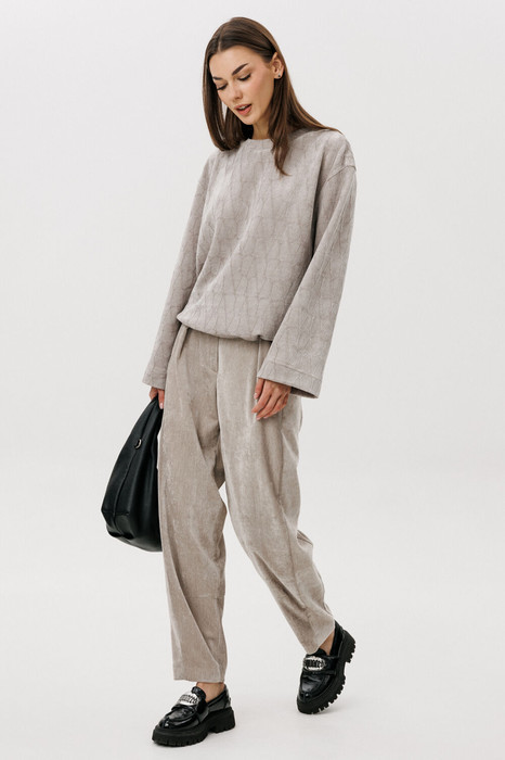 Свободный джемпер расширенного силуэта втачного покроя на заниженной линии плеча. Рукав расширенный в области оката. По низу  джемпера шнур- резинка с фиксаторами. Брюки "баррел" на притачном поясе со шлёвками (эластичном в области спинки), с наклонными карманами , мягкими складками защипами по верху брюк.