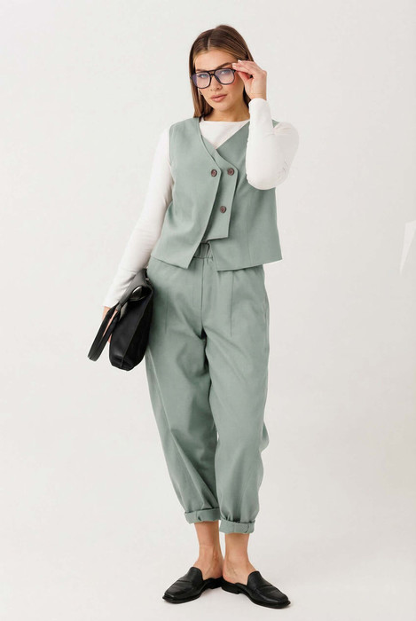Элегантный брючный комплект в нежном фисташковом оттенке — стильное решение для создания актуального и утончённого образа. Свежий цвет придаёт лёгкость и современное звучание классическому силуэту.