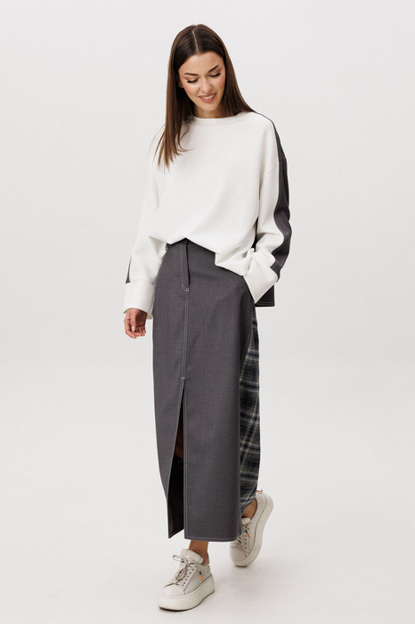 Свободный и стильный костюм для повседневного образа. Невероятный комбинированный свитшот, в котором полочка и часть рукава из мягкого вискозного трикотажа, а спинка из однотонного текстильного полотна. Силуэт-свободный, покрой-рубашечный, круглая горловина с обтачкой, спинка с отрезной кокеткой и мягкими складками. По боковым швам-разрезы.