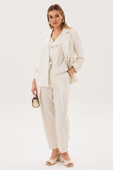 Однотонный жакет из смесовой ткани с добавлением льна гармонично дополняет комплект. Лёгкий, дышащий материал обеспечивает комфорт даже в тёплую погоду, а минималистичный крой делает образ сдержанным и элегантным.