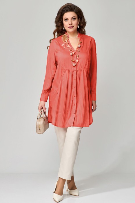 Комплект двойка "Медея". Туника женская, прямого силуэта. Выполнена из хлопковой ткани. Рукав втачной, длинный, по низу притачная манжета с застежкой на пуговицы. Длина рукава регулируется патой. Фигурный вырез горловины, оформленный отрезными планками. Застежка на пуговицах. Воротник стойка. По переду выполнены фигурные карманы с небольшой сборкой по верхнему краю. По линии талии подрез с небольшой сборкой. На спине изделия прямая кокетка, посередине бактовая складка. Низ изделия фигурный, по боковым швам выполнены разрезы. Джинсы - брюки, зауженные к низу, с застежкой на молнию и пуговицы, в боковом шве - карман, по спинке пояса - резинка. Брюки со стандартной посадкой (средней).