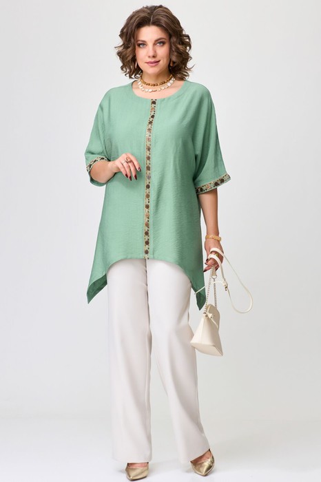 "Женский комплект ""Удеса"" состоит из брюк и туники свободного покроя. Туника оверсайз выполнена из текстильной ткани без подкладки, ткань легкая, стрейч и очень практичная в носке. Рукав цельнокроеный, горловина обработана обтачкой, обтачка закреплена отделочной строчкой. Низ изделия обработан швом в подгибку, по центру полочки нашита тесьма  (монетки на сетке), низ рукава тоже обработан декоративной тесьмой.