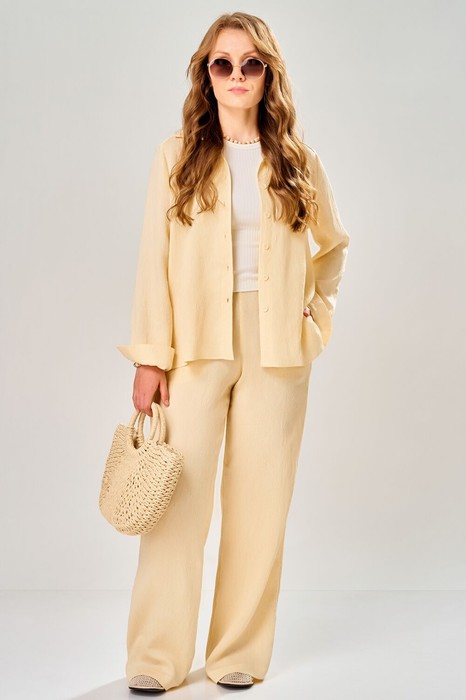 Женский брючный комплект "Магрита" выполнен из текстильной ткани "Нотус" и состоит из брюк и рубашки. Этот комплект выполнен из натуральных тканей (хлопка и льна), а также для эффекта создания легких полосочек используется во составе нейлон.