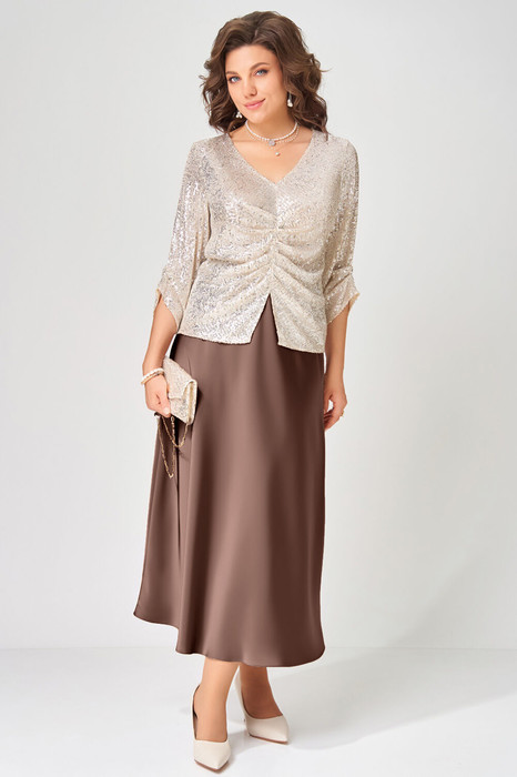 ""Зария"" — сияющий акцент вашего новогоднего образа. Блузка, расшитая пайетками, ловит свет при каждом движении, а сатиновая юбка добавляет торжественности и утончённости. Идеальный дуэт для праздников, когда хочется блистать. Сумка-клатч ""Зария"" — это не просто аксессуар, а настоящее украшение вашего образа.