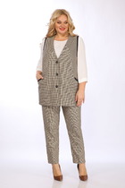 Костюм женский с юбкой и жакетом полуприлегающего силуэта на подкладке выполнен из костюмной ткани высокого качества в деловом стиле. Жакет со втачными рукавами, воротником пиджачного типа и прорезными карманами с клапанами по переду застегивается на петли и пуговицы, по низу рукавов функциональные потайные молнии. Юбка классическая "карандаш" с притачным поясом, в боковые швы которого вставлены резинки, застегивается на тесьму-молнию, петлю и пуговицу; сзади шлица.