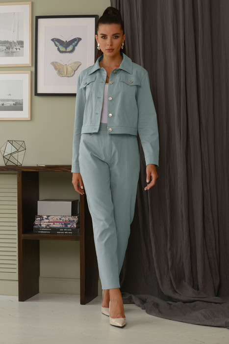 Костюм женский - жакет и брюки, изготовлен из текстильной ткани с небольшим содержанием стрейча. Жакет длиной немного ниже линии талии. Рукав длинный, рубашечного типа, линия проймы спущена. Застежка до верха на петли и пуговицы. В верхней части переда и спинки - кокетки. Нижняя часть переда и спинки оформлена вертикальными рельефами. По переду под кокетками находятся декоративные клапаны. На задней части рукава-рельеф с манжетой внизу и застежкой на петли пуговицы. Низ жакета оформлен планкой. Воротник стояче - отложной, без стойки спереди.