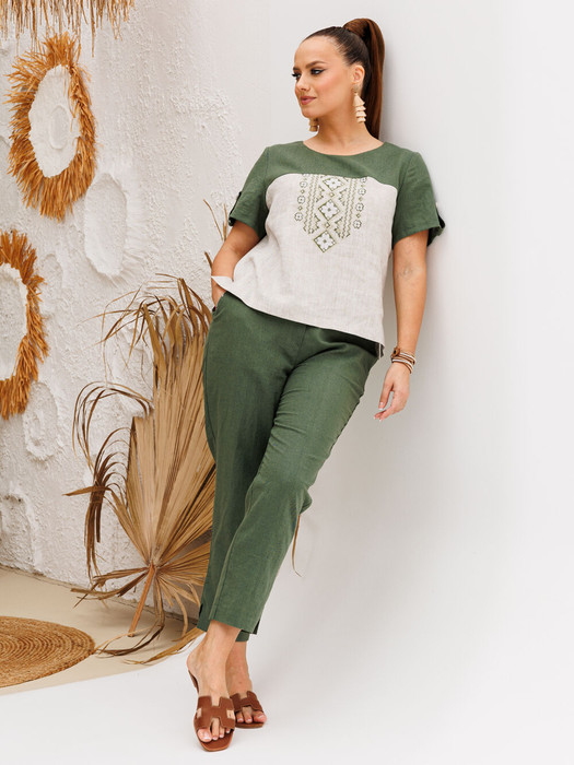 Очень стильный, удобный комплект состоящий из блузки и брюк, выполнен из 100% льна двух цветов. Блузка прямого силуэта с коротким рукавом который украшен патой, застёгивающий на петлю и пуговицу .Авторская вышивка в народном стиле, очень украшает данное изделие.