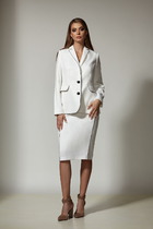 Костюм состоит из жилета и брюк, выполеных из костюмной ткани. Жилет полуприлегающего силуэта  с воротником пиджачного типа.  Перед с рельефами, талиевой вытачкой и декоративным клапаном.  Застежка центральная однобортная на 2 петли и пуговицы. Спинка со средним швом и рельефами. Вдоль оката рукава выполнена декоративная планка. К жилету прилагается тонкий пояс из основной ткани.  Брюки расширеные книзу с притачным поясом. Спереди застежка гульфик на молнии и с петлей и пуговицей по поясу. По задней частям брюк вытачки. В боковых швах карманы с наклонным входом. По поясу широкие шлевки. Брюки со срелками застроченными по переду и заутюженными сзади. Длина жилета - 71 см, длина брюк с учетом пояса - 109 см.
