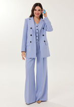 Джемпер прямого силуэта с воротником поло. Рукав втачной одношовный. По низу изделия, по низу рукава и по воротнику проложена отделочная строчка. Брюки расширеные книзу на притачном поясе. По поясу настрочены шлевки. По передним и задним частям брюк вытачки. На задних частях брюк настрочены карманы. Карманы, вытачки, пояс, низ брюк отделаны отделочной строчкой. Длина брюк с учетом пояса - 109 см, длина джемпера- 66 см, длина рукава - 30 см,