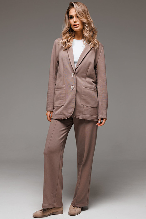 Костюм Gowear из футера в стиле smart casual поможет создать в меру строгий и одновременно расслабленный образ. Костюм состоит из жакета и прямых брюк. Жакет прямого силуэта с воротником и лацканами, имеет удобные карманы и застежку на 2 пуговицы. На левом лацкане вышивка-логотип в контрастном цвете. Низ и борта имеют открытые края (эффект необработанного шва), укреплены дополнительной строчкой. Жакет без подкладки. Брюки прямые. На передних половинках - отделочная строчка по стрелкам и удобные боковые карманы. Пояс из ткани кошкорсе, с резинкой и контрастным шнурком.