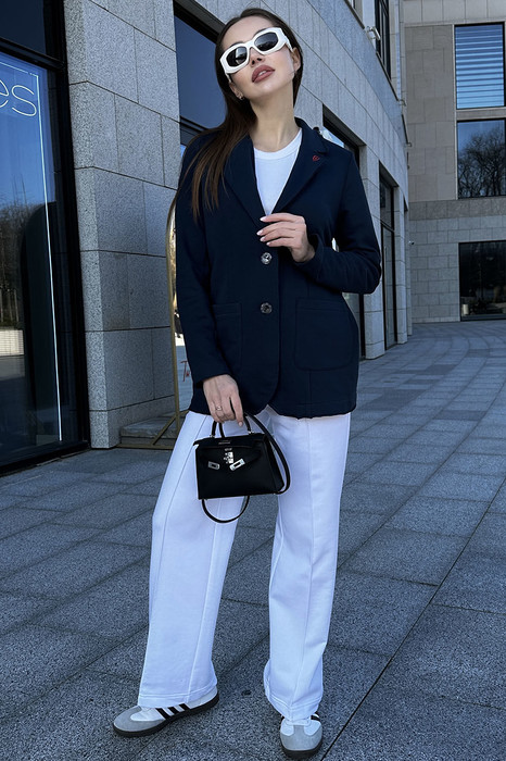 Костюм Gowear из футера в стиле smart casual поможет создать в меру строгий и одновременно расслабленный образ. Костюм состоит из жакета и прямых брюк. Жакет прямого силуэта с воротником и лацканами, имеет удобные карманы и застежку на 2 пуговицы. На левом лацкане вышивка-логотип в контрастном цвете. Низ и борта имеют открытые края (эффект необработанного шва), укреплены дополнительной строчкой. Жакет без подкладки. Брюки прямые. На передних половинках - отделочная строчка по стрелкам и удобные боковые карманы. Пояс из ткани кошкорсе, с резинкой и контрастным шнурком.