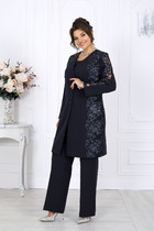 Блузон с центральной застежкой на петли и пуговицы, втачным воротником с отрезной стойкой. На уровне линии груди расположены накладные карманы. Спинка цельная. Низ фигурный. Рукав втачной, длинный, с отреной манжетой, застегивающейся на одну петлю и пуговицу. Юбка короткая, без пояса, верхний срез обработан обтачкой. Застежка на потайную молнию в среднем шве заднего полотнища.