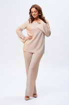Блузон с центральной застежкой на петли и пуговицы, с втачным воротником и отрезной стойкой. По шву притачивания планки- рюши. По низу блузона- пояс. Плечо спущенное. Спинка цельная. Рукав втачной, длинный, с отрезной манжетой. Брюки зауженные к низу, с отрезным поясом, на поясе расположены шлевки. По спинке пояс присборен на резинку. По боковым швам расположены карманы. Вход в карман наклонный к боковому шву. Передние половинки брюк с двумя односторонними складками. Застежка гульфик.