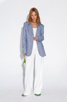 Блузка с центральной застежкой на петли и пуговицы по планке переда. Воротник втачной с отрезной стойкой. По переду- вставка. Спинка со средним швом. Рукав -крылышко. Брюки- с отрезным поясом. Пояс присборен на резинку в области спинки. По боковым швам расположены карманы. Вход в карман наклонный к боковому шву. На передних половинках- односторонние складки.