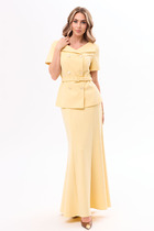 Блузка с втачным воротником с отрезной стойкой, центральной застежкой на петли и пуговицыпо отрезной планке. Плечо спущенное, рукав втачной, короткий. Шорты прямые, с отрезным поясом, пояс присборен на резинку.