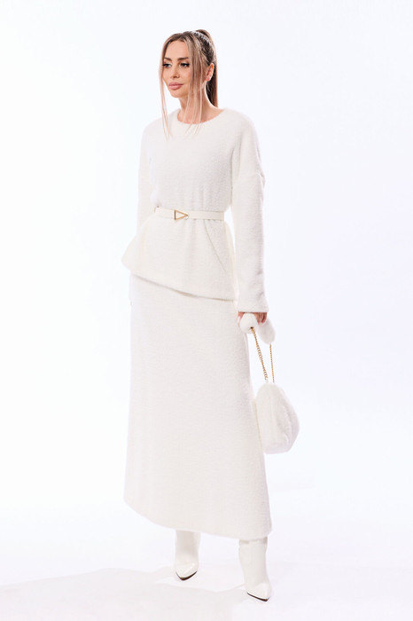 Блузон, без воротника, с круглым вырезом горловины, застежкой на навесную петлю и пуговицу в среднем шве спинки. По спинке со средним швом. Рукав втачной, длинный. Юбка без пояса, по верхнему срезу юбки- резинка. Комплект со съемным поясом.