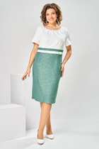 Жакет с центральной застежкой на петли и пуговицы, без воротника, с V-образным вырезом горловины. По переду с талиевыми вытачками и рельефами, выходящими из проймы, прорезными карманами в рамку, расположенными на уровне линии талии. Спинка со средним швом, рельефами, выходящими из проймы. Рукав втачной, короткий. Брюки с отрезным поясом, на поясе по переду расположены декоративные пояски с пряжками. Пояс в области спинки присборен на резинку. Застежка гульфик. По боковым швам расположены карманы. Вход в карман наклонный к боковому шву.
