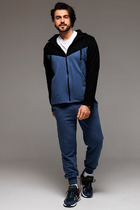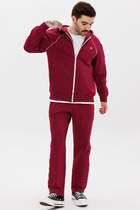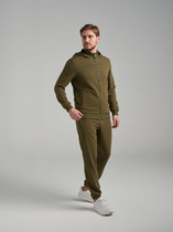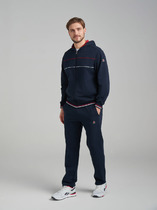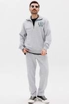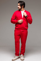 Костюм мужской футболка и брюки. Футболка прямая с втачным коротким рукавом, с V-образной горловиной, обработанной узким воротником. Спинка цельнокроенная с кокеткой на полочке. В шве кокетки отделочный кант, на груди накладной карман. Низ рукава и изделия подгибка. Брюки свободного силуэта с притачным поясом, карманы "хулиган". По боковому шву отделочный кант. Низ изделия подгибка.