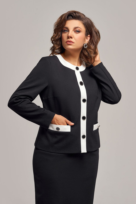 Костюм женский, состоящий из жакета и юбки. Жакет полуприлегающего силуэта из мягкого трикотажного полотна средней плотности, частично на трикотажной подкладке, с плечевыми накладками, рукава втачные, по переду функциональные карманы, застежка на петли и пуговицы. Декор по планке, горловине, листочке кармана из ткани контрастного цвета.