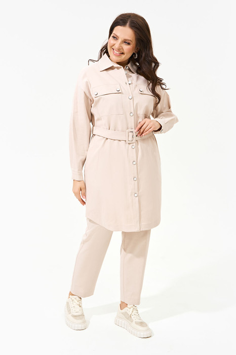 Джинсовый женский костюм с брюками и рубашкой. Рубашка удлиненная свободного силуэта с функциональными накладными карманами по переду и в боковых швах, рукава со спущенной линией плеча с манжетами, воротник рубашечный, застежка-планка на петли и пуговицы. Брюки полуприлегающего силуэта заужены к низу, пояс притачной на резинке по бокам, застежка на молнию, петлю и пуговицу, в боковых швах карманы. В комлект входит сьемный пояс из основной ткани. Материал при правильном уходе не теряет своих свойств.