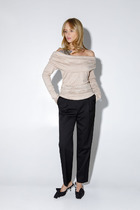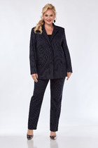 Костюм женский полуприлегающего силуэта с юбкой и джемпером выполнен из плотного трикотажа.  В джемпере V-образная горловина и втачные рукава дополнены декоративными вставками молочного цвета. Юбка "карандаш" с завышенной линией талии на подкладке с антистатическим эффектом и поясе-обтачке, сзади шлица и застежка на молнию. Изделие прошло тестовую стирку при температуре 30 градусов и химическую чистку: не меняет цвет и не линяет.