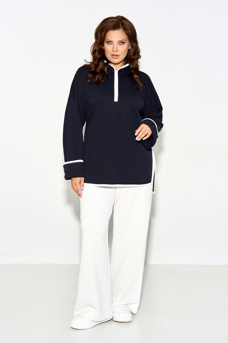 Стильный женский спортивный костюм  свободного силуэта, состоящий из худи и брюк, выполнен из футера 3-х нитки класса пенье. Худи с капюшоном,  функциональной молнией по переду и декоративными разрезами по боковым швам; рукава втачные со спущенной линией плеча. По низу манжет, капюшона и линии втачивания молнии вставлена тесьма белого цвета. Брюки свободного силуэта с притачным поясом полностью на резинке (резинка закреплена и не будет перекручиваться) и функциональными карманами в боковых швах. Костюм полностью соответвует заявленному размеру. Пожалуйста, пользуйтесь таблицей обмеров готового изделия. Контрастные ткани устойчивы к перекрашиванию благодаря современным технологиям, что предотвращает  смешивание красок, сохраняя цвета ткани  даже при совместной стирке.