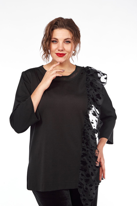 Джемпер женский прямого силуэта, изготовлен из трикотажного полотна. Горловина оформлена довязом. По переду ассиметричный подрез, в котором вставлена рюша из органзы с флоком. Блуза декорирована пришивными камнями. Рукава втачные, длиной 3/4.