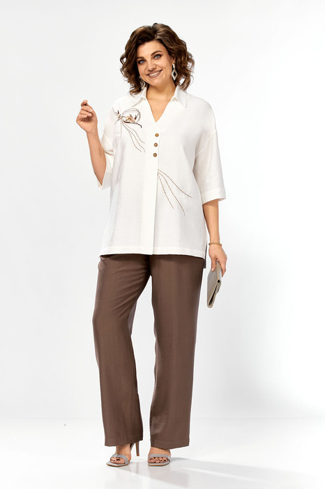 Костюм брючный, двухпредметный, состоит из блузы и брюк. Выполнен из ткани с эффектом крэша. Блуза свободного силуэта с горловиной V-образной формы и стояче-отложным воротником. По переду обработана односторонняя складка с имитацией застежки. Спинка с фигурными подрезами, в районе талии, по центру кулиса присобранная на эластичную тесьму. Рукава спущенные. Блуза декорирована дизайнерской вышивкой. Брюки прямого кроя, классической посадки. Пояс притачной на эластичной тесьме. В передних деталях брюк обработаны карманы с подрезным бочком.