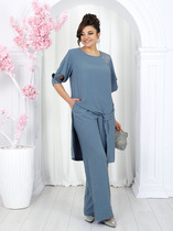 Стильный костюм прямого силуэта из текстильной ткани мятного цвета. Костюм состоит из рубашки и брюк. Рубашка с отложным воротником и цельнокроеными рукавами. По переду рубашки выполнена планка с застежкой на пуговицы. Рубашка дополнена накладными карманами. Верхняя часть брюк обработана поясом с резинкой. По бокам брюк - внутренние карманы. В комплект входит пояс. Рост фотомодели - 170 см.