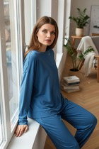 Джемпер женский кроя «летучая мышь». Центральная часть переда и спинки выполнены из ткани-компаньона. По переду расположена авторская печать с пласт. украшением. Низ переда декорирован довязом. Боковые части переда и спинки с рукавом выполнены из основной ткани. Рукав по низу обработан довязом. Горловина округлой формы с довязом.