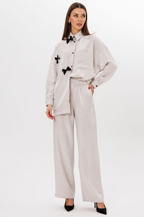Этот костюм из блестящей пудровой ткани, состоящий из блузы и брюк, представляет собой гармоничное сочетание элегантности и современного стиля. Блуза украшена двумя нагрудными карманами, контрастными черными пуговицами и изысканными декоративными бантами, добавляющими утонченность и женственность. Прямые брюки свободного силуэта с карманами в боковых швах обеспечивают комфорт и создают элегантный образ. Этот костюм идеально подходит для создания стильного и эффектного наряда, подчеркивая вашу индивидуальность и безупречный вкус.