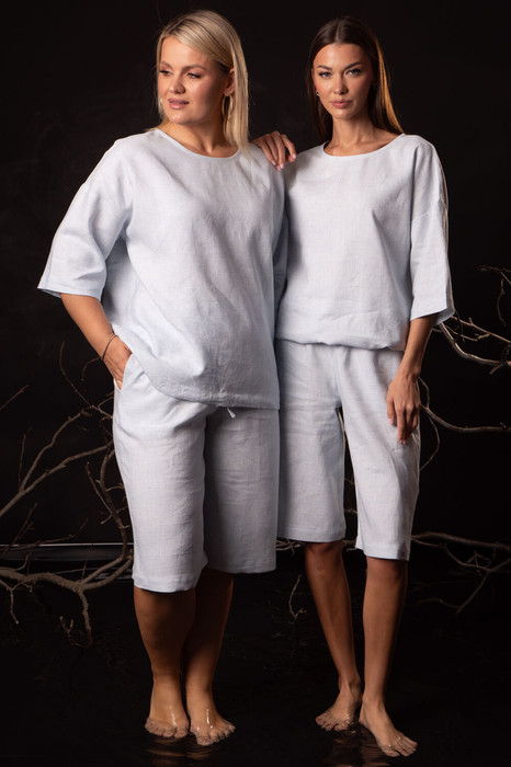 Эксклюзивный летний костюм из белорусского льна с вискозой — идеальное сочетание элегантности, комфорта и функциональности. Набор включает джемпер свободного прямого силуэта со съемным декоративным бантом и шорты на эластичной резинке с боковыми карманами. Натуральные материалы обеспечивают дышащую легкость, гипоаллергенность и устойчивость к деформации, сохраняя безупречный вид даже в жаркие дни.