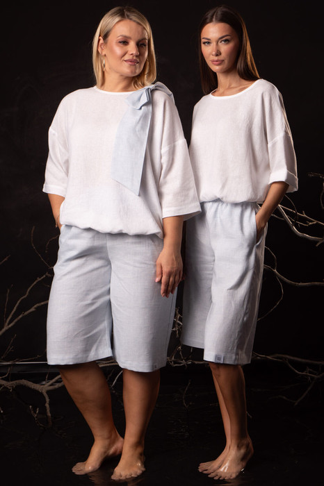 Женский костюм из льна с вискозой премиум-класса. Комплект: джемпер со съемным бантом в комплекте и шорты.