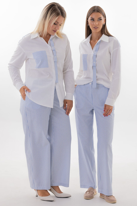 Прямые брюки средней посадки из той же ткани в полоску завершают ансамбль. Заутюженные стрелки по переду и спинке подчеркивают безупречный крой и добавляют образу строгости и четкости. Прямой силуэт обеспечивает комфорт и универсальность.