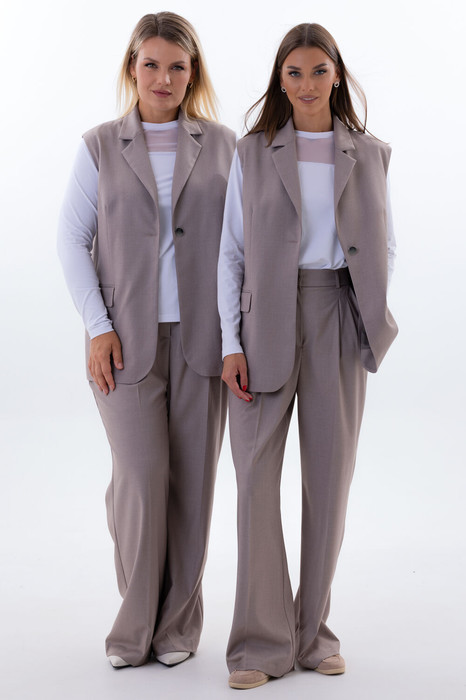 Брюки палаццо с высокой посадкой и свободным клешем создают эффектный контраст с четкими линиями жилета. Их струящийся силуэт визуально вытягивает фигуру, даря ощущение легкости и непринужденной элегантности. Сшитые из той же костюмной ткани, они подчеркивают целостность ансамбля.