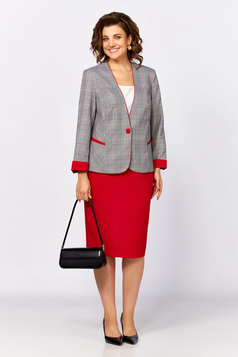 Элегантный дизайн костюма с жакетом подарит комфорт и уверенность в себе. Выполненный из комфортной костюмной ткани. Жакет приталенного силуэта длиной до линии бедер, с застежкой на одну пуговицу на линии талии. Горловина глубокая V-образная, край борта по низу закругленный. Полочки декорированы листочками из отделочной ткани. Рукав три четверти с разрезами в локтевом шве. Низ рукава обработан обтачкой из отделочной ткани, позволяющей отвернуть рукав в виде манжета. На подкладке. Юбка-карандаш на поясе-обтачке. Сзади застежка-молния и разрез по низу юбки. На подкладке. Топ из стрейчевой ткани с рукавом. Горловина V-образная обработанная планкой.