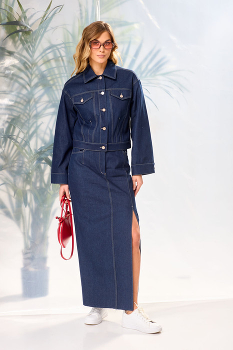 Юбка на талии из джинса, плотно облегающая вверху и прямая к низу, длиной до середины икр, с притачным поясом. Застежка на  тесьму-молнию и 1 петлю и пуговицу. Переднее полотнище юбки со средним швом, с левым рельефным швом, который заканчивается разрезом, справа расположены вытачка. В боковых швах обработаны карманы фигурной формы, на левом бочке обработан «часовой карман». Заднее полотнище юбки со средним швом и с 2-мя вытачками,  с кокетками, с 2-мя накладными карманами. По поясу прикреплены 5 шлевок.
