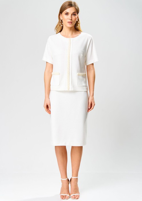 Комплект женский (джемпер и юбка) из трикотажного полотна. Джемпер женский, полуприлегающего силуэта, длиной до линии бедер, с втачными рукавами. Деталь переда джемпера с нагрудными вытачками, по центру втачная планка, на которой настрочена декоративная тесьма. С двумя накладными карманами фигурной формы, по верху карманов расположена декоративная тесьма. Рукава втачные одношовные, короткие. Вырез горловины округлой формы, обработан обтачкой.