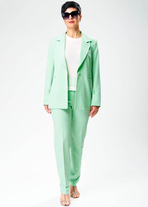 Комплект из костюмной ткани нежных, весенних  оттенков.Жакет женский, свободного силуэта,  на подкладке, длиной ниже линии бедер, с втачными рукавами, с центральной сквозной застежкой на 1петлю и 1 пуговицу до линии перегиба лацкана. Детали переда жакета с отрезными бочками, горизонтально расположенными боковыми прорезными карманами  с листочками, и талиевыми вытачками от разрезов карманов. Деталь спинки жакета с рельефными швами и со средним швом, который заканчивается шлицей. Рукава втачные двухшовные, с передним и локтевым швами,  внизу передних швов обработана шлица и декоративно прикреплены по 2 пуговицы над закрепкой. Воротник отложной пиджачного типа. Углы воротника и лацканов острые. Края воротника, лацкана, борта, клапанов обработаны в чистый край. Жакет с притачной понизу подкладкой.