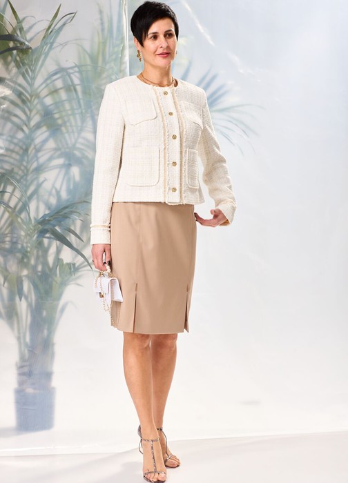 Жакет женский,  полуприлегающего силуэта,из буклированной трикотажной ткани молочного цвета на подкладке,  длиной до линии бедер, с втачными рукавами, с центральной сквозной застежкой на 5 петель и 5 пуговиц. Детали переда жакета с нагрудными вытачками, с 2-мя накладными карманами с каждой стороны, по центру вертикально расположена декоративная тесьма. Деталь спинки жакета с плечевыми вытачками. Рукава втачные двухшовные, с передним и локтевым швами, по низу рукавов горизонтально расположена декоративная тесьма. Вырез горловины округлой формы «под горло». Жакет с притачной понизу подкладкой.